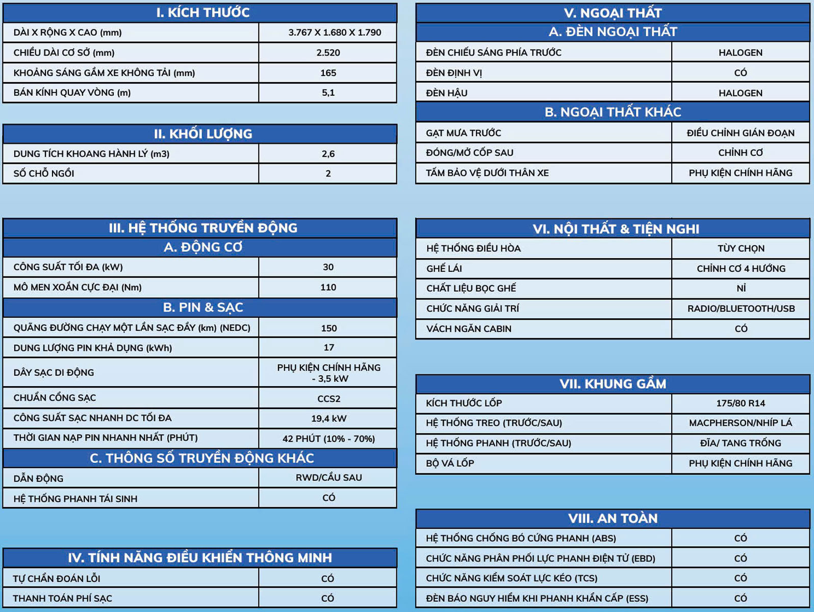 VinFast EC Van trang bị một động cơ điện, công suất 30 kW, sức kéo 110 Nm và tốc độ tối đa 75 km/h. EC Van với thiết kế nhỏ gọn, kích thước dài, rộng và cao lần lượt 3.767 x 1.680 x 1.790 (mm), chiều dài cơ sở 2.520 mm. Khoang lái 2 chỗ ngồi cùng khoang hành lý phía sau với dung tích chứa hàng lên tới 2.600L, tải trọng trên 600 kg, tối đa hóa năng suất vận chuyển trong từng chuyến đi.